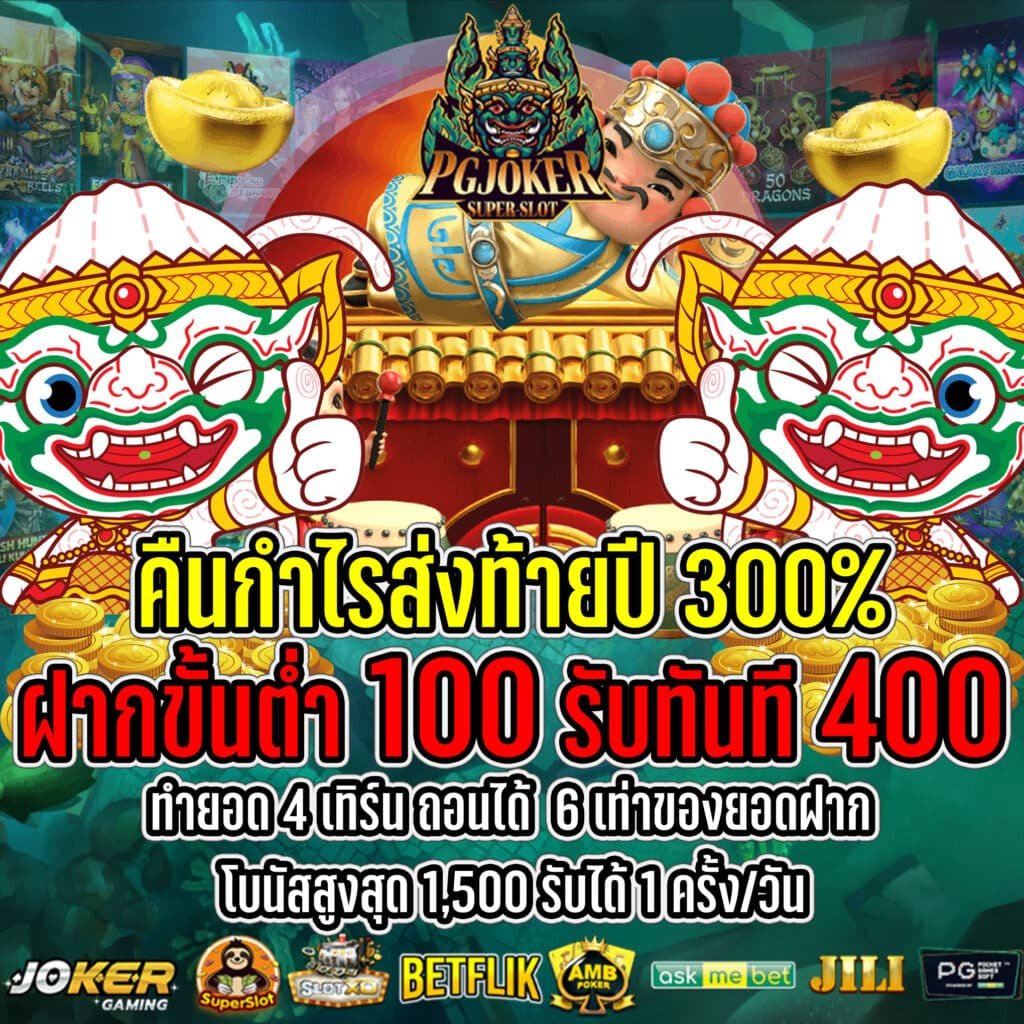 คืนกำไรส่งท้ายปี 300% ฝากขั้นต่ำ 100 รับ เพิ่มทันที 400 ทำยอด 4 เทิร์น ถอนได้ 6 เท่าของยอดฝาก รับได้ 1 ครั้ง/วัน